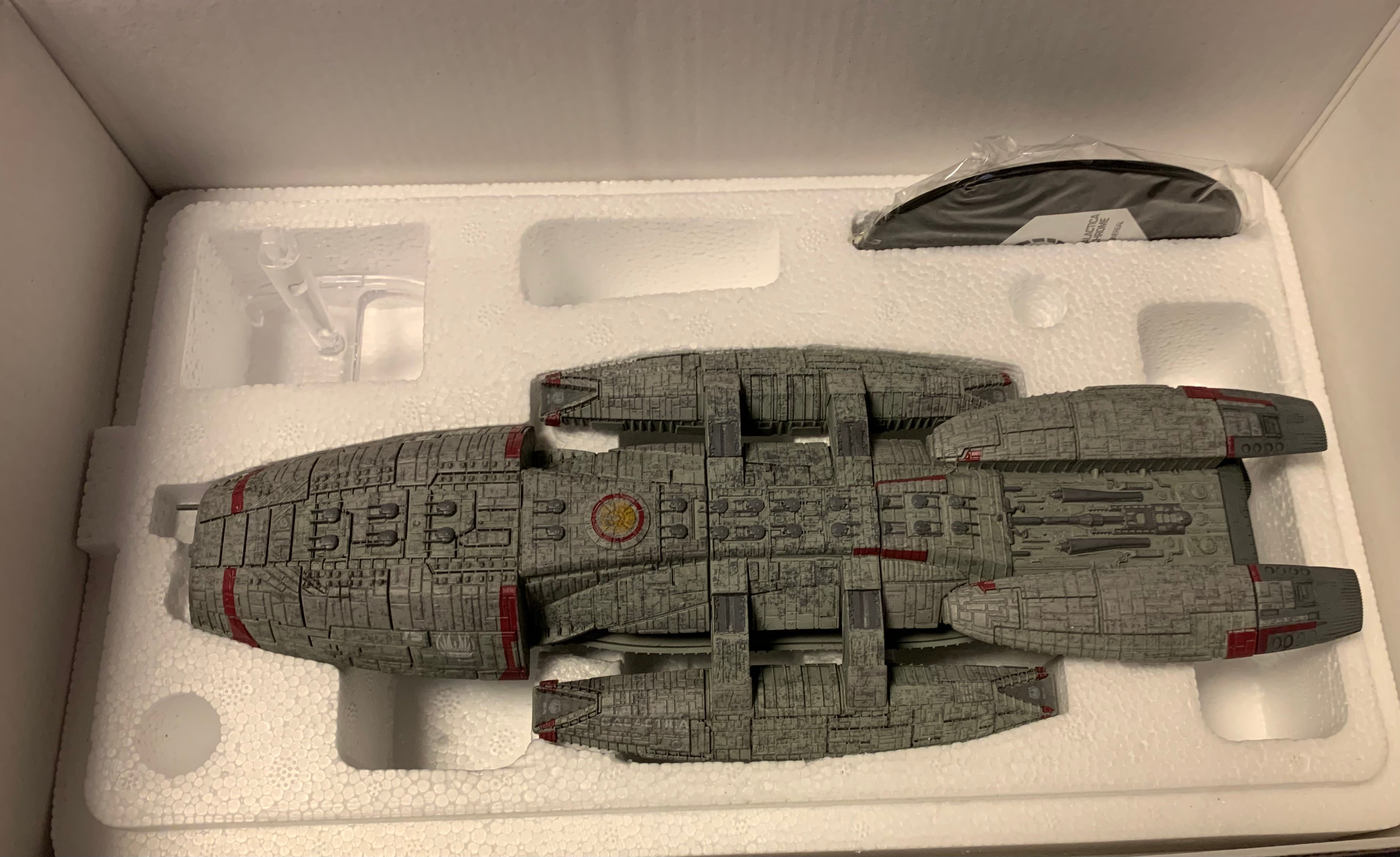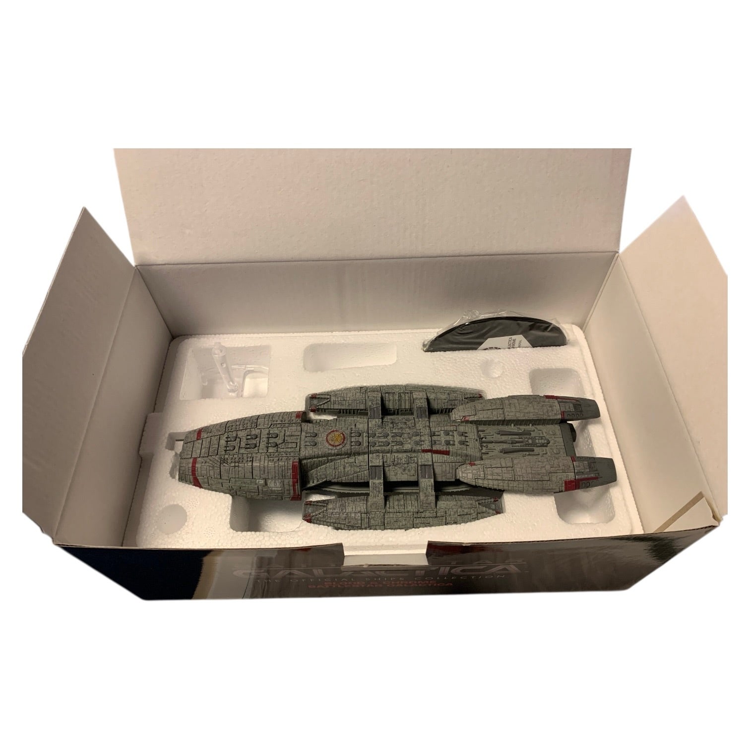 Official die-cast model ship of Battlestar Galactica, designed with the help of the Galactica VFX team.